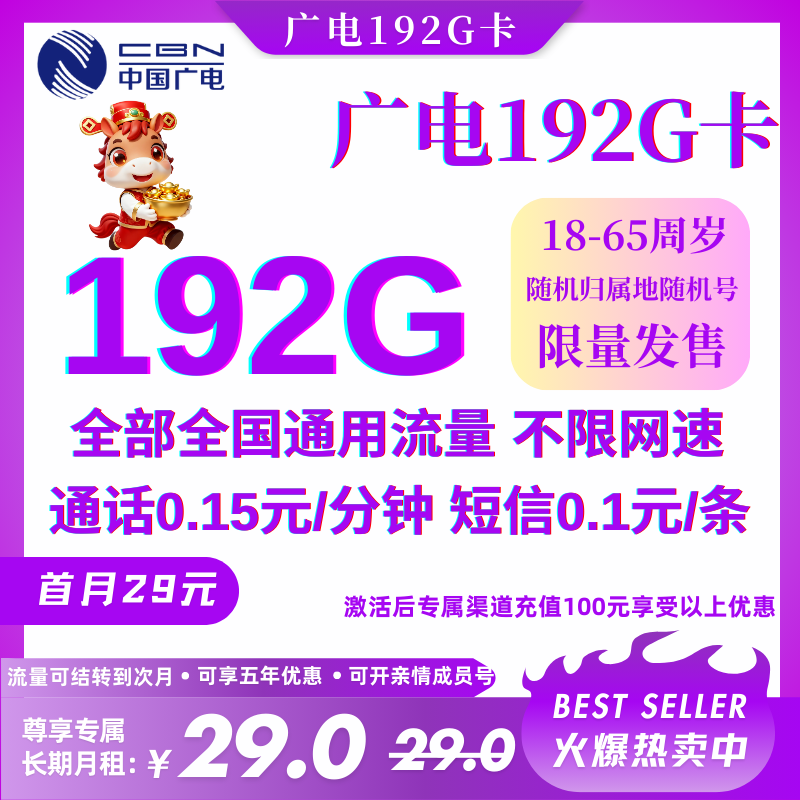 29元192G全国通用流量+0.15元/分钟(首月不免费,随机归属地随机号)