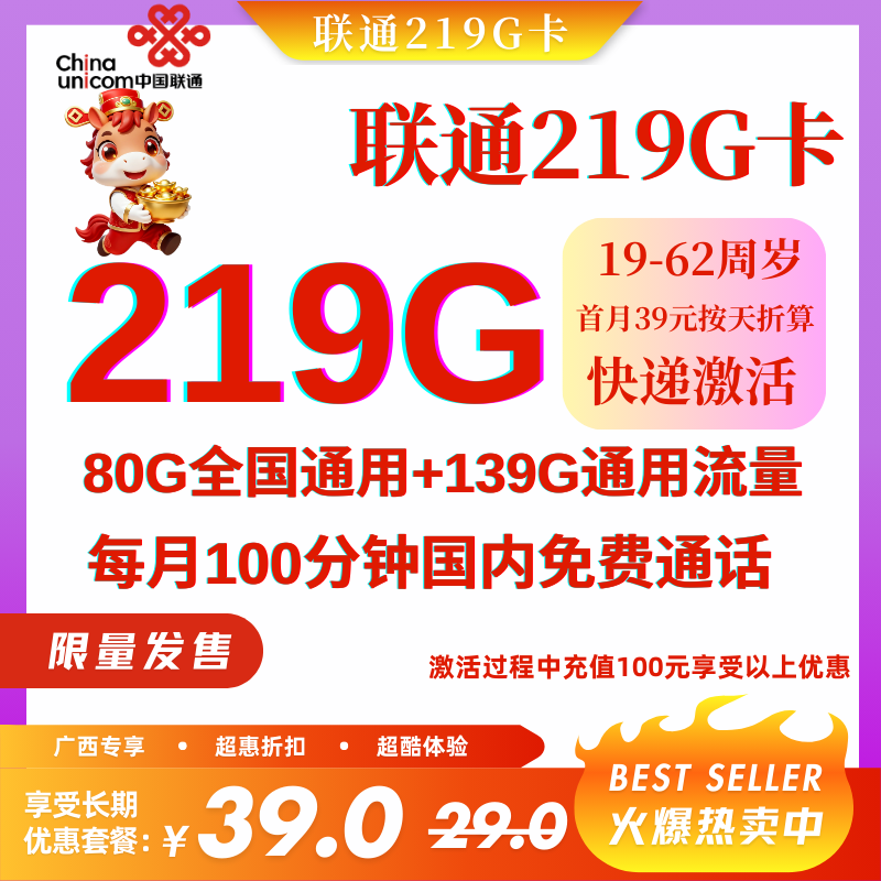 39元219G全国通用流量+100分钟国内通话(长期套餐)