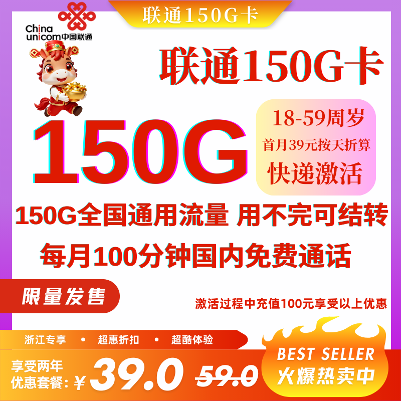 39元150G全国通用流量+100分钟国内通话(两年套餐)