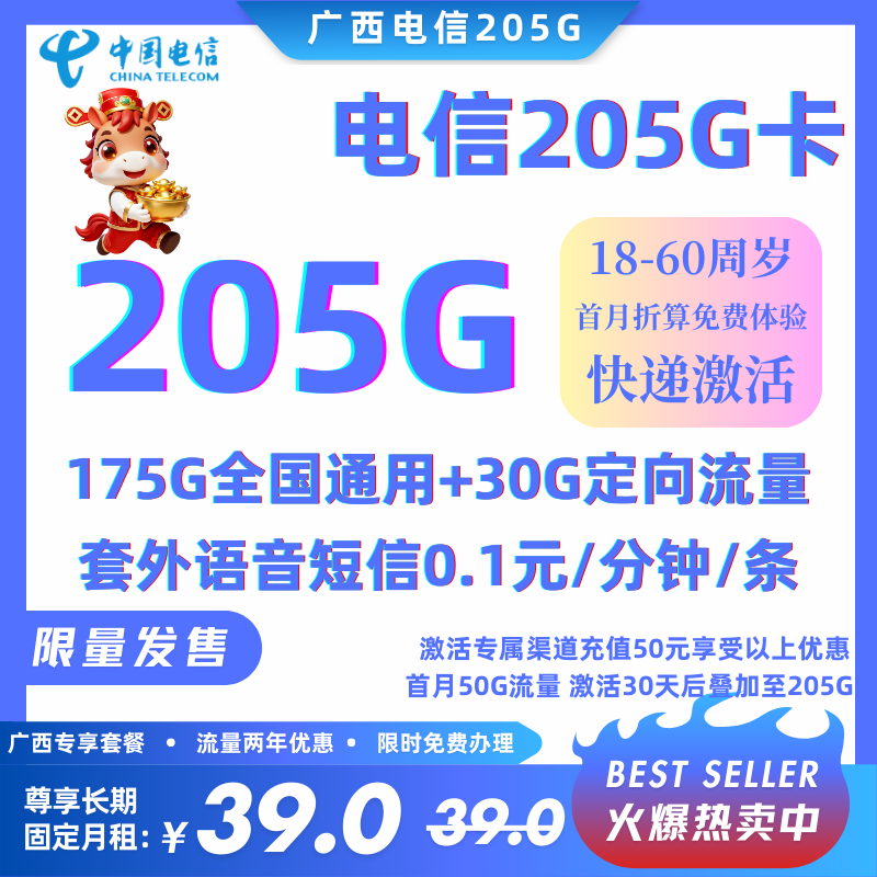 39元205G全国流量+300分钟通话(首月免费50G按天,30天后205G流量)